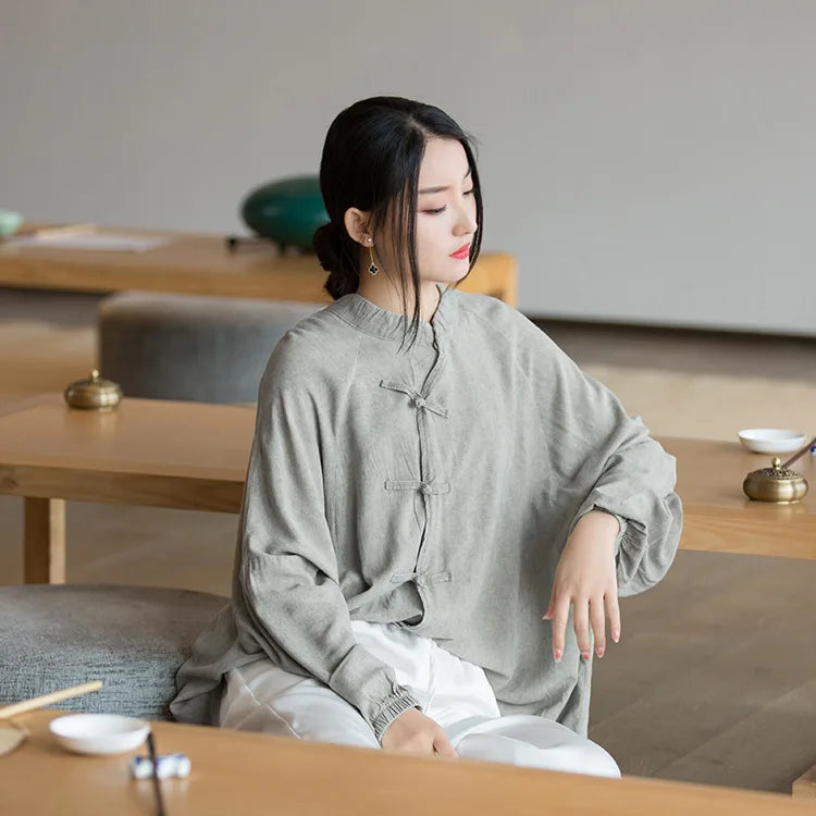 Chinese Style Women Long Sleeve Casual Shirt New Arrival 2024 Autumn Vintage Stand Collar Loose Female Basics Tops Shirts M249
