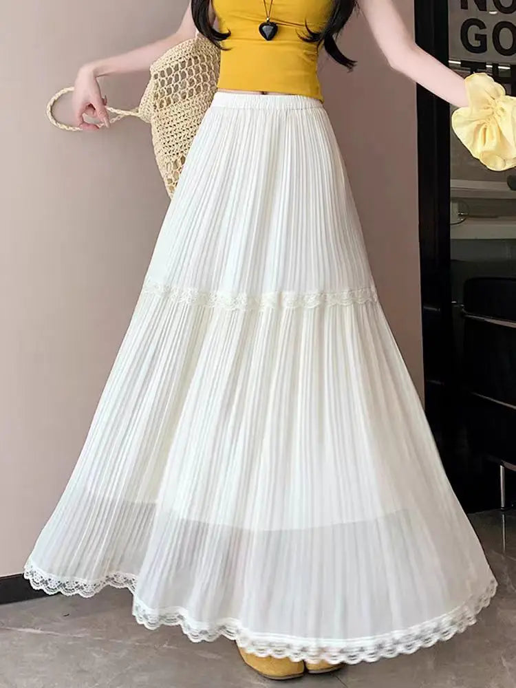 Summer High Waist Chiffon Pleated Skirt - Stretchy A-Line Flowy Midi Skirt with Lace Trim, Slimming Casual Long Skirt for Women