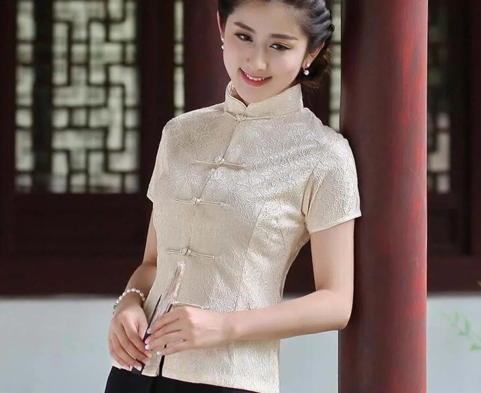 Wholesale Chinese Traditional Women Short Sleeve Jacket Satin Lace Tang Coat Casual T Shirt Slim Tops Blouse Size M L XL XXL 3XL